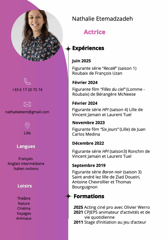 Formation, expériences, courts et longs métrages, théâtre, publicités, doublages, langues parlées, compétences techniques ou sportives — tout ce qui illustre ma trajectoire et mon potentiel.